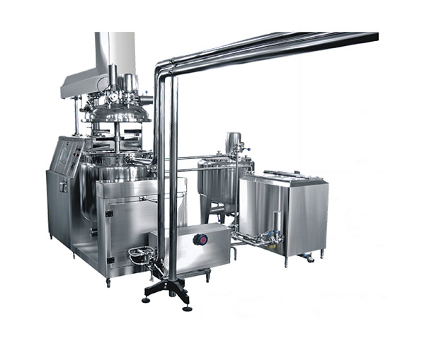 科瑞机械使用的真空乳化成套设备采用上部同轴三重型搅拌器,液压升降开盖,快速均质搅拌器转速:0-1800r/min(变频调速)、慢速刮壁搅拌器转速:10-70r/min(变频调速)、均质头采用高剪切涡流式乳化搅拌机,慢速刮壁搅拌自动紧贴锅底及锅壁。在搅拌过程中经凸轮转子泵将物料做外循环工作,使物料完全能达到乳化效果。采用真空吸料、特别对粉体物料利用真空吸入避免粉尘飞扬。整个工序在真空条件下进行,防止物料在高速搅拌后产生气泡,能达到卫生无菌要求。本机组对配制好的物料通过液位控制自动供料至包装机容器。本系统配有CIP清洗系统、容器与物料接触部分采用SUS316L材料制造、内表面镜面抛光300EMSH(卫生级)为了确保控制部分的稳定、电器控制部分采用德国西门子公司产品、按纽采用日本富士公司产品、变频器采用日本松下电工、真空泵采用西门子公司产品。本机组完全符合GMP要求制造,是目前国内最先进、最理想的栓剂配制装置。