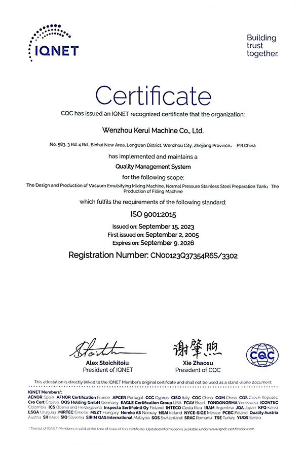 Wenzhou Kerui Machinery Co, Ltd. is the drafting member of the pharmaceutical vacuum emulsification blender industry standard,and the member of China Pharmaceutical Equipment Association,engaging in design,manufacture and sales of pharmacy,cosmetic,biotechnology equipment and hygiene fluid fittings, with reinforced technical force,fine processing equipment,complete quality control system and experienced in pharmacy,cosmetic,biotechnology and food machine.We are the leading manufacturer of vacuum emulsification machine and have the capability to design the products as request. We provide you the service from inquiry to lifetime use of equipment backing on our own design team and processing factory.